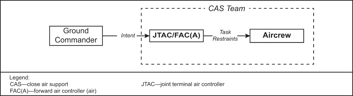 The number of people a CAS team may comprise depends on the supported ground echelon or mission size. All the team members can be grouped into two categories: JTACs/forward air controllers (airborne) (FAC(A)s) and supporting aircrew. JTACs/FAC(A)s are the ground commander’s direct representatives. As such, they receive the ground commander’s intent and translate it into orders (or a 9-line) for the aircrew.[1] The aircrew executes actions based on the 9-lines to make the ground commander’s intent into reality. The 9-line, then, is the core mechanism by which the JTAC/FAC(A) communicates intent and restrictions to the aircrew, see figure 1.