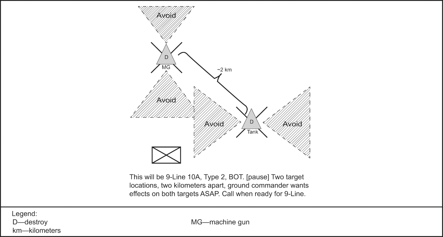 The ground commander nominates a machine gun position and single, stationary tank north and northeast from the company’s position respectively. The JTAC/FAC(A) has only one flight of fixed-wing fighters on station, and the ground commander wants both targets struck as soon as possible. The JTAC/FAC(A) quickly plots both targets, builds a description, and determines the nearest friendly positions. Considering the targets and the aircraft’s remaining ordnance, the JTAC/FAC(A) determines that a Type 2 bomb on target attack is the best approach. The JTAC/FAC(A) could pass two 9-Lines, one for each target, but decides that a single 9-Line will be faster and provide sufficient situational awareness. Assessing the friendly and target positions, the JTAC/FAC(A) identifies that different attack restrictions are required for each target (see Figure 2). This is another indication that two 9-Lines may be the best choice, but for argument’s sake this JTAC/FAC(A) will proceed with a single 9-Line. With a complete picture built, the JTAC/FAC(A) is ready to pass the game plan.