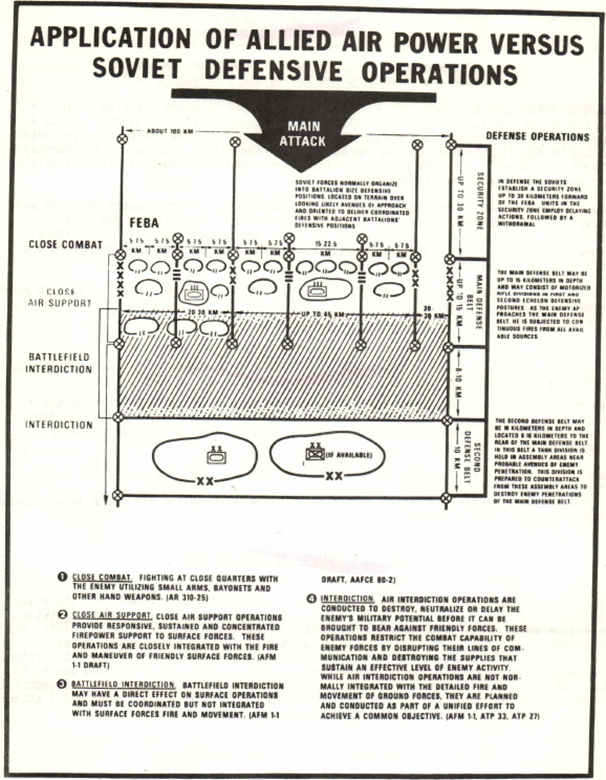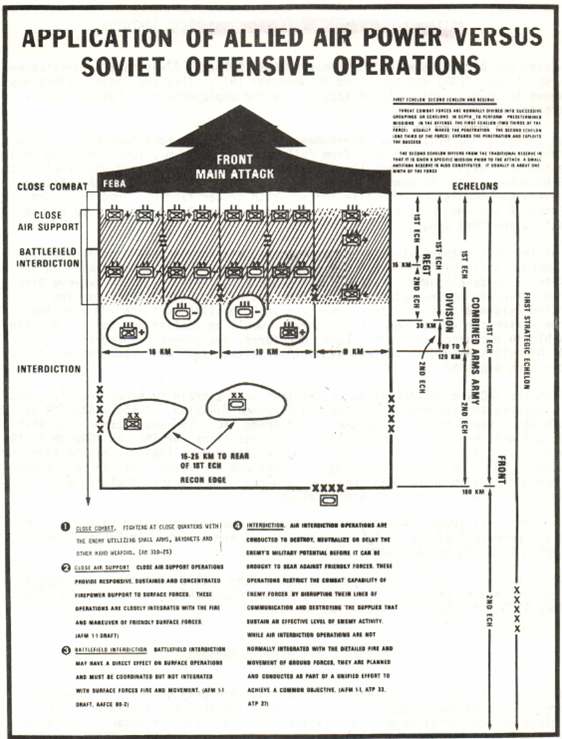 HQ TRADOC Air-Land Programs Office has formulated a chart that depicts Soviet echeloning in offensive operations and where Allied air power may be applied. As the accompanying chart portrays, there are a number of first and second echelons in the Soviet scheme of operations. Obviously, Allied air power will be applied to the depth of the battlefield and may include the friendly side of the forward edge of the battle area (FEBA) which is not shown here.