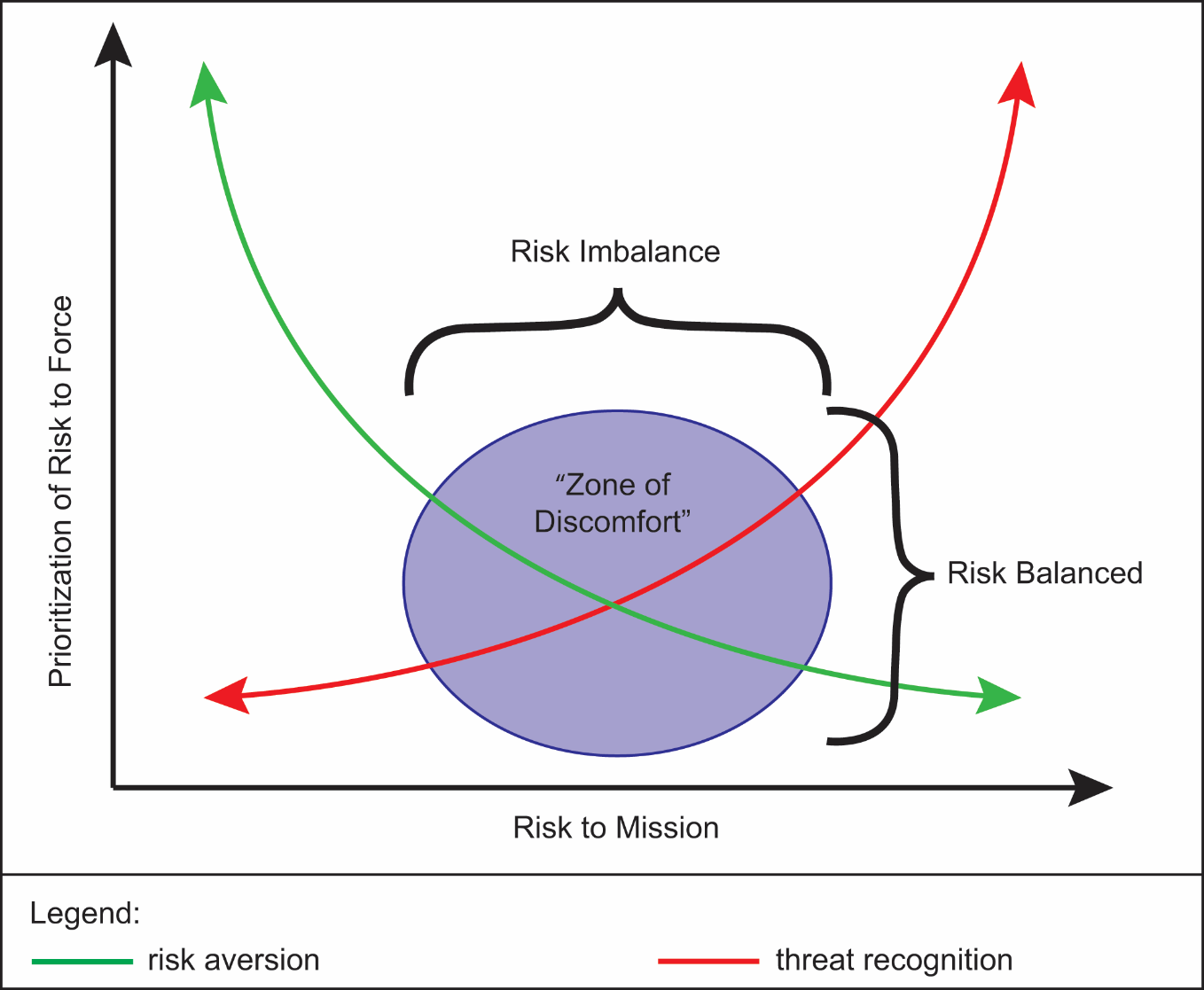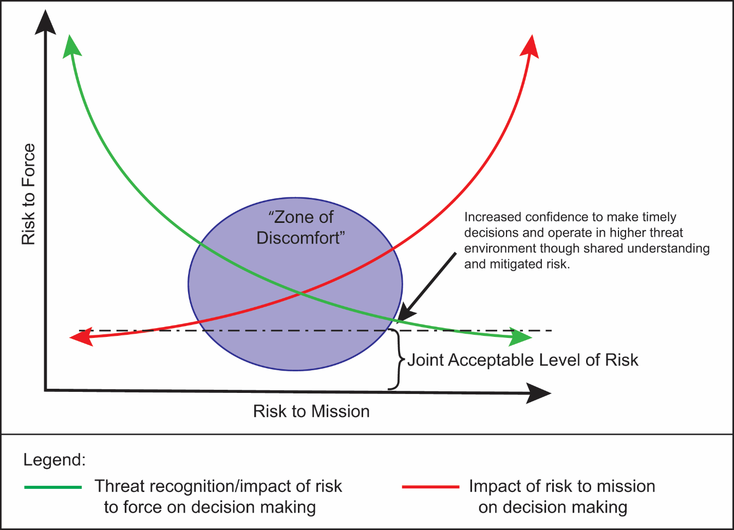 Within the "Zone of Discomfort", leaders must decide whether to accept greater risk to force than they normally would, based on a perceived degree of mission risk; or conversely, risk mission failure based on self-imposed constraints that inhibit potentially high-risk/ high-payoff actions. To further complicate matters, as we assess risk in the multi-domain environment, leaders will have to make difficult decisions about what truly constitutes a risk to joint missions worthy of a corresponding risk to joint forces.