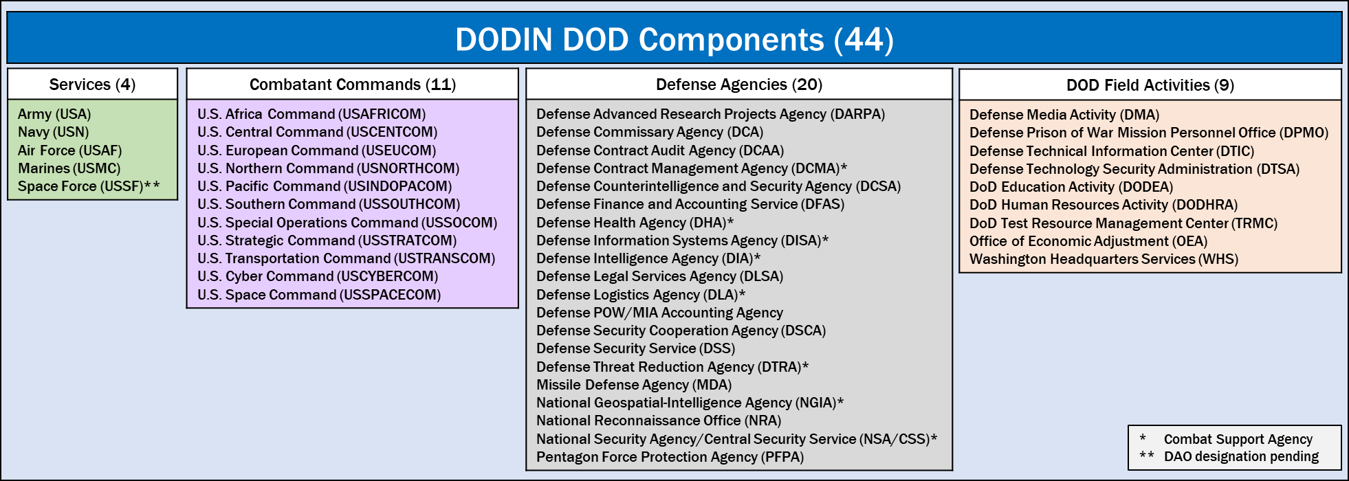 The DOD cyberspace backbone is called the DODIN.[4] The DODIN is the biggest network in the world. It is composed of 44 different DOD components made up of service, agency, and combatant command constructed networks (Figure 2). The DODIN is DOD’s classified and unclassified enterprise. Within each DOD component constructed network are thousands of subordinate networks, information technology equipment, tools and applications, weapon system technologies and data spanning across bases, posts, camps, and station levels.