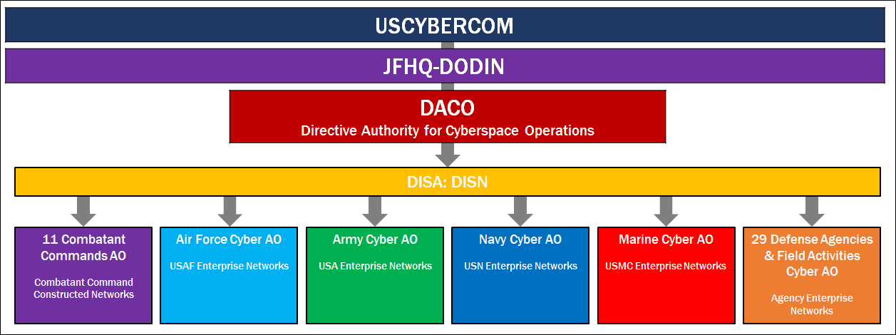 Each of the 44 DOD components owns a portion of the DODIN area of operation (DAO) and is responsible for protecting it. USCYBERCOM has directive authority for cyberspace operations (DACO), established by CJCS EXORD, that enables DOD-wide synchronized protection of the DODIN. DACO has been delegated to JFHQ-DODIN and provides authority to direct cyberspace operations related to global DODIN operations and DCO-IDM within each DOD component’s DAO. (Figure 4).