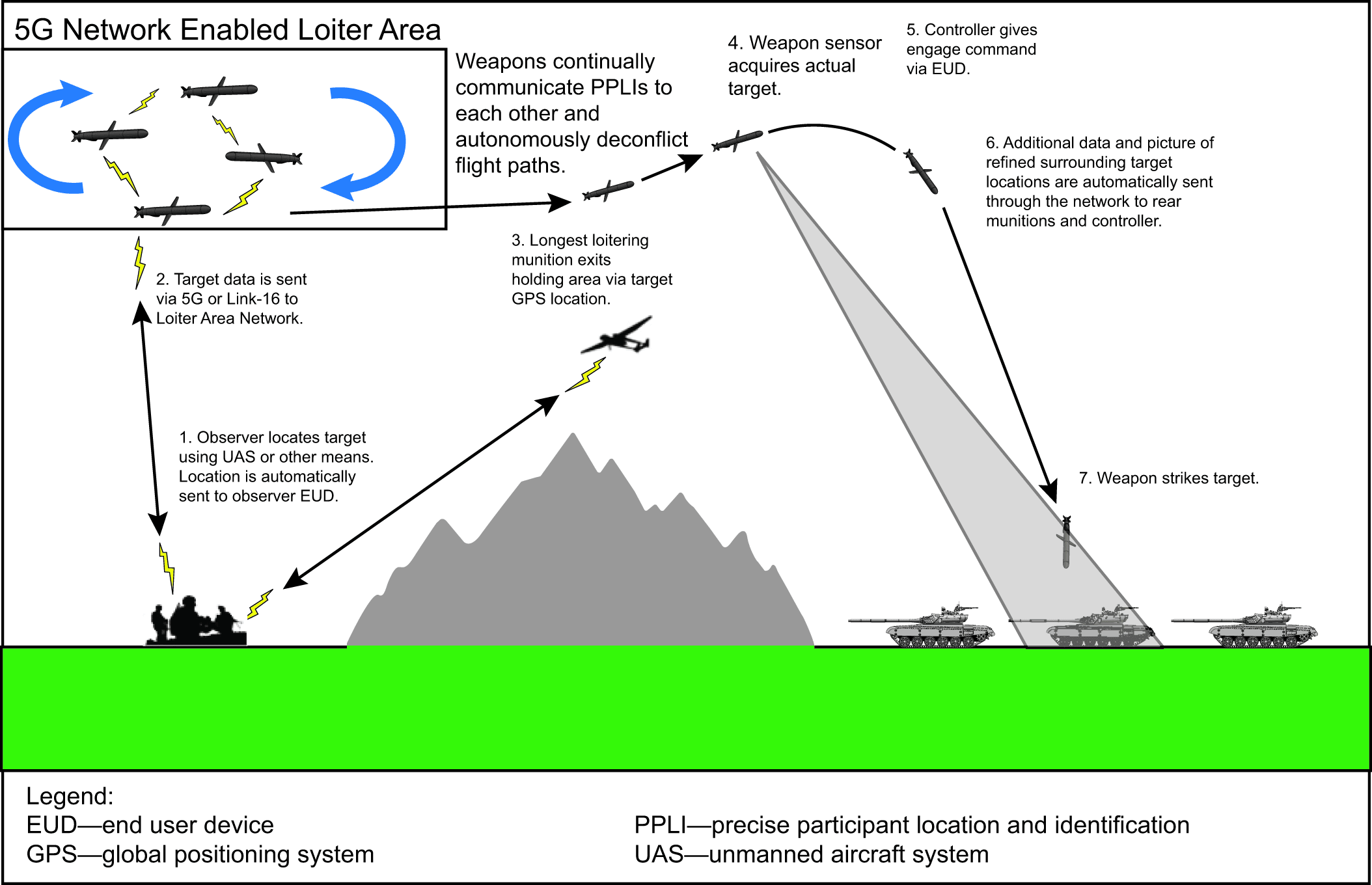 In addition to collaborative combat aircraft, with mMTC and URLLC, the military can take advantage of a massive autonomous near-instantaneous strike capability through network enabled munitions. These long-range munitions will have extended loitering time and be able to autonomously fly to an airspace coordination area (ACA) near the forward edge of the battlefield while talking to other munitions within that ACA to remain deconflicted in transit. From this ACA, they will constantly be receiving targeting data from forward sensors, soldiers, drones, radar, etc. within the network. Network enabled weapons will allow air or surface launch through multiple types of platforms and go immediately to strike a target or to its designated loiter area for future engagements.